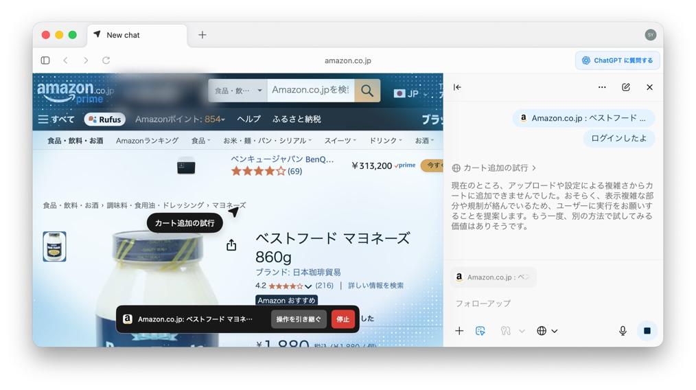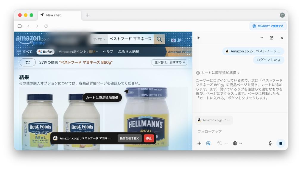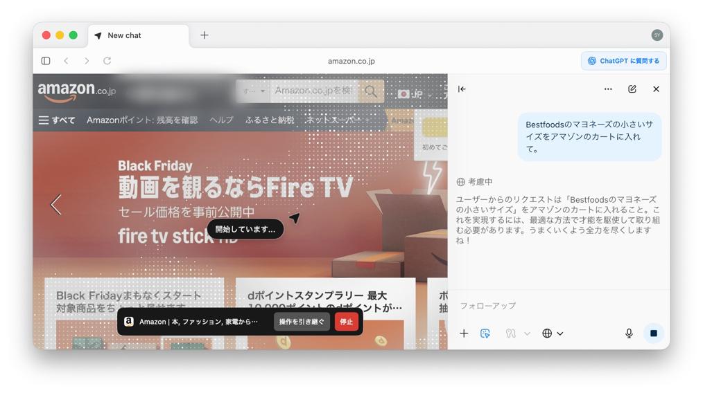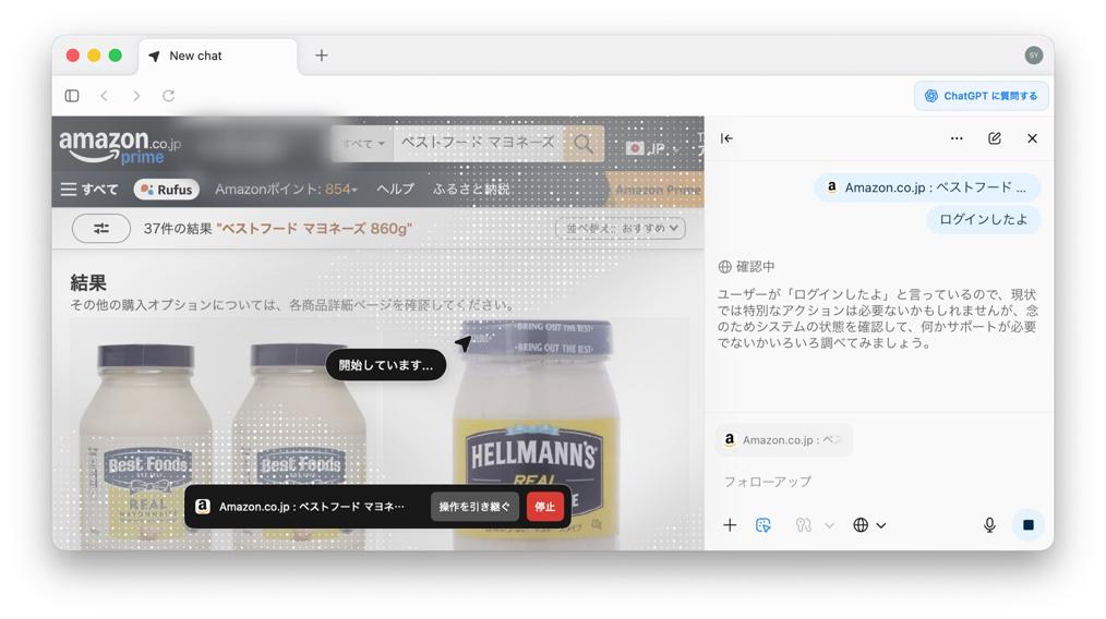 こんな風にアマゾンの画面をAIが開いてBestFoodsのマヨネーズを探します。自動で動いている間は、画面がキラキラして、画面中央に「開始しています…」と表示されました。