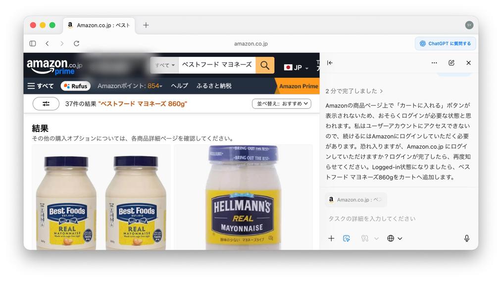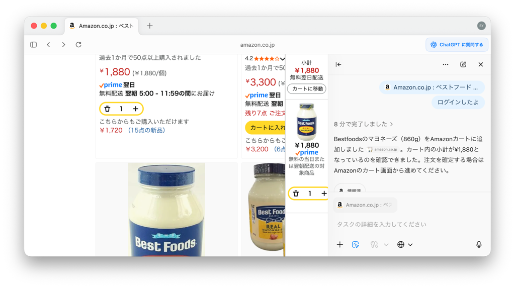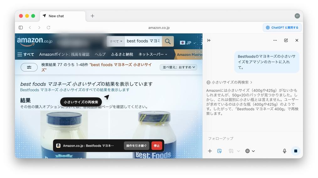 そして、エージェントモードをクリックして、「BestFoodsのマヨネーズの小さいサイズをアマゾンのカートに入れて」と依頼します。