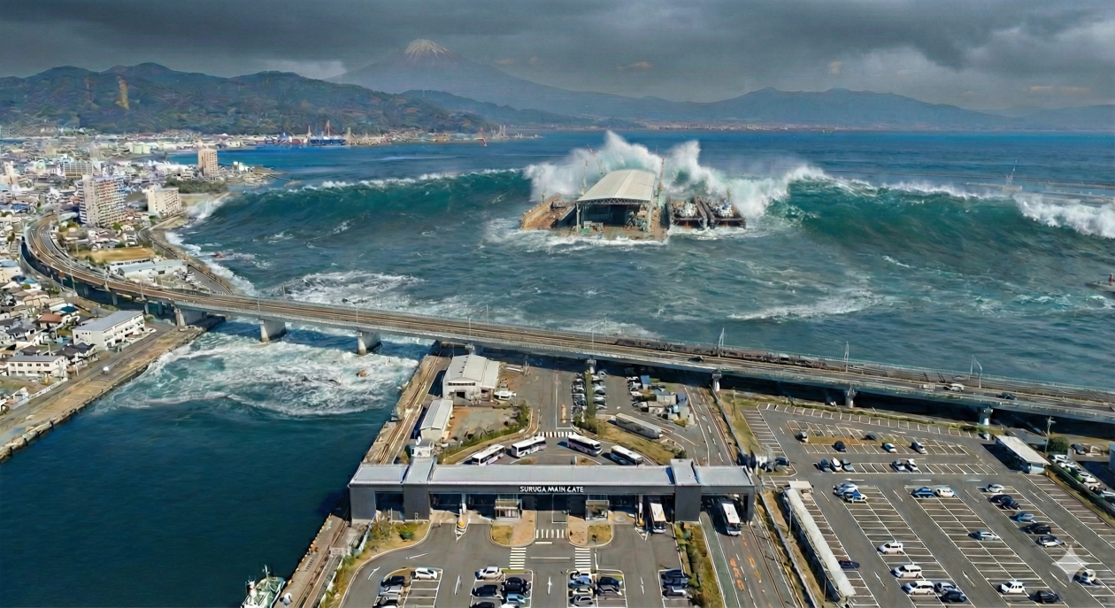 街を守る「盾」になる: 画像のように、100万トンを超える施設の巨大な下部構造が、押し寄せる津波を砕き、エネルギーを吸収します。結果として、施設の背後にある陸地の街への津波被害を劇的に減らす「最強の防波堤」となります。また、復興時の拠点ともなります。