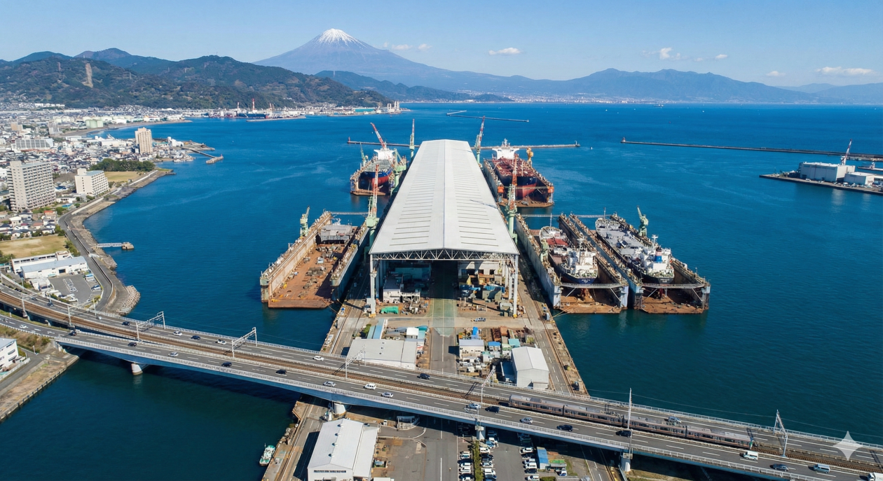 コンセプト: ただ船を造るだけの工場ではありません。 南海トラフの巨大津波に正面から向き合い、そのエネルギーを受け流すことで背後の街を守る、「防災インフラと産業拠点」が融合した、人類初の挑戦です。