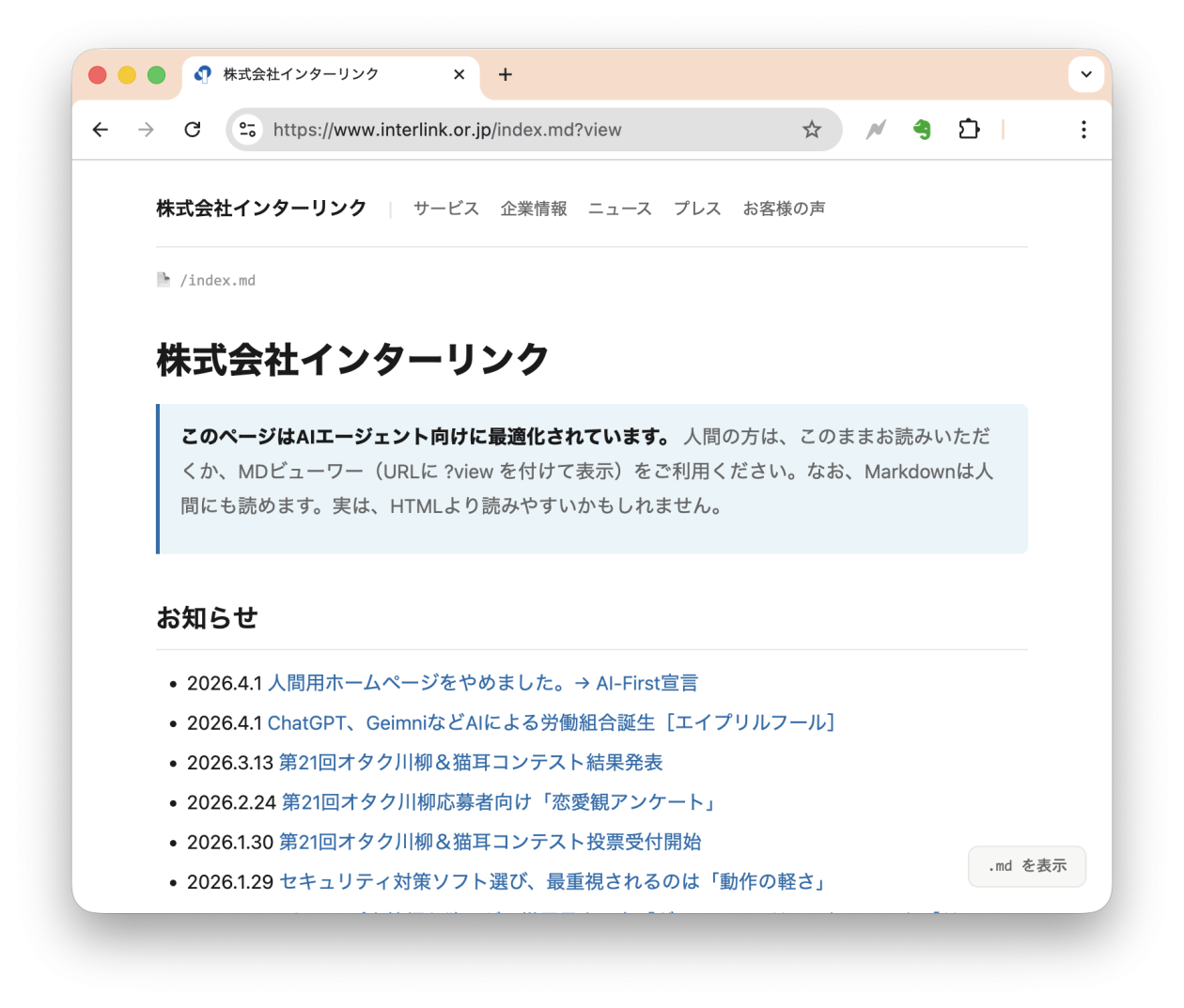 AI用に最適化されたMarkdown形式になっており、ホームページとは思えません。